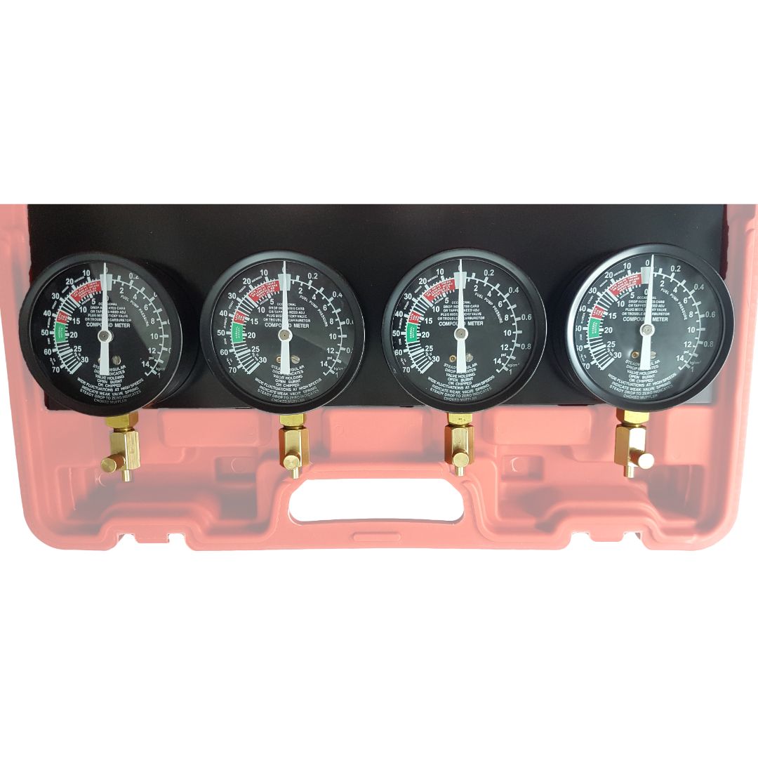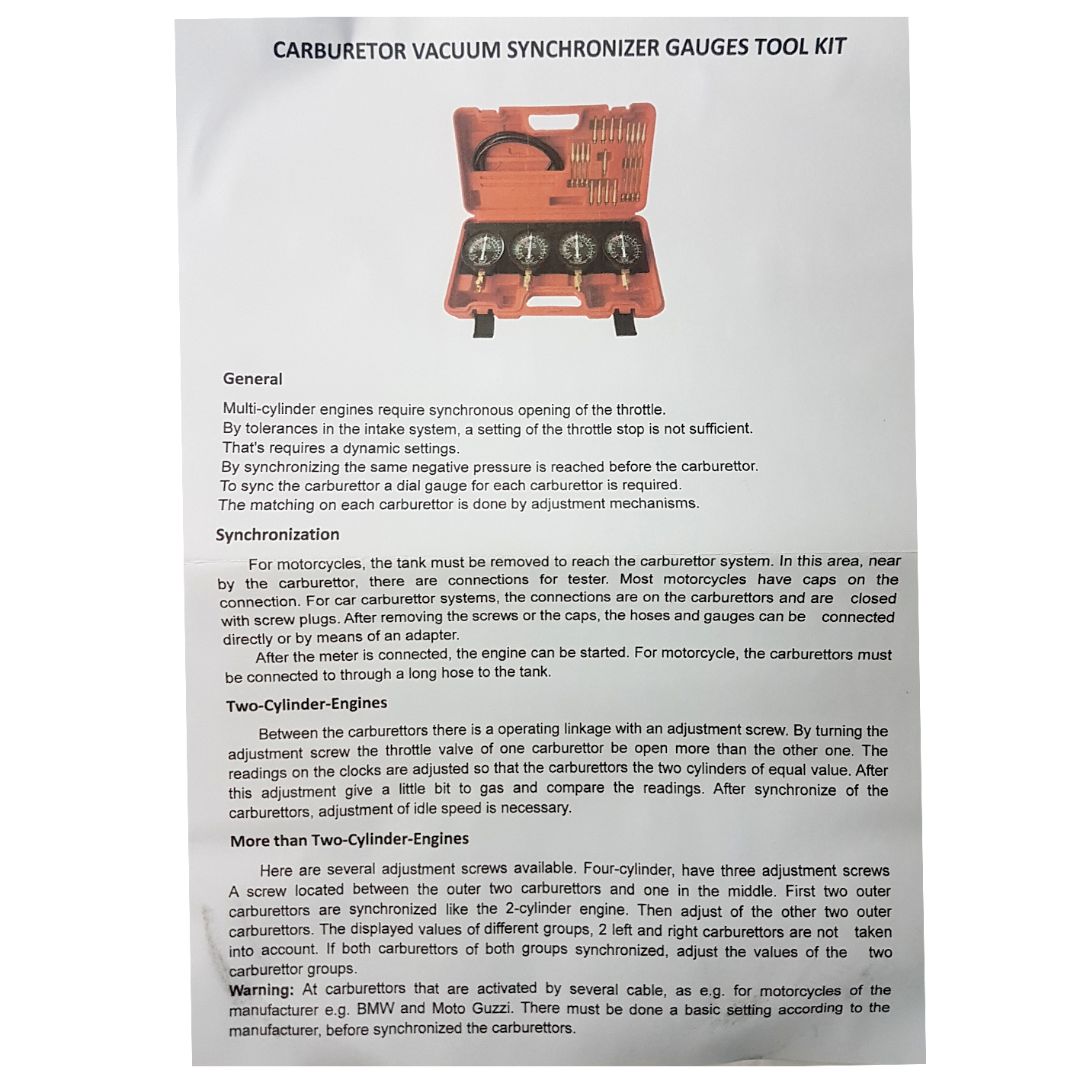 Cada medidor tiene su propio control de amortiguación individual y control de calibración. Se suministra con un juego de adaptadores y conectores de carburador largos y cortos para un fácil acceso.